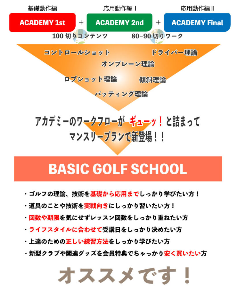 アカデミープランには合わせて十九の検定試験があります。 それをそのまま受け継いだ『BASIC GOLF SCHOOL』は受け継ぎマンスリー化されました。